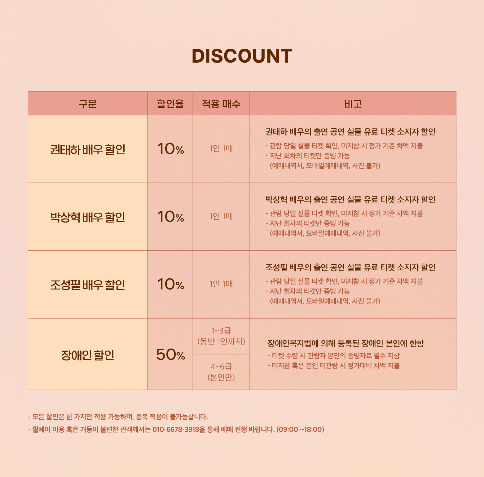 월~토요일 관람시: 전일 17시까지 / 일요일 관람시: 전일 11시까지