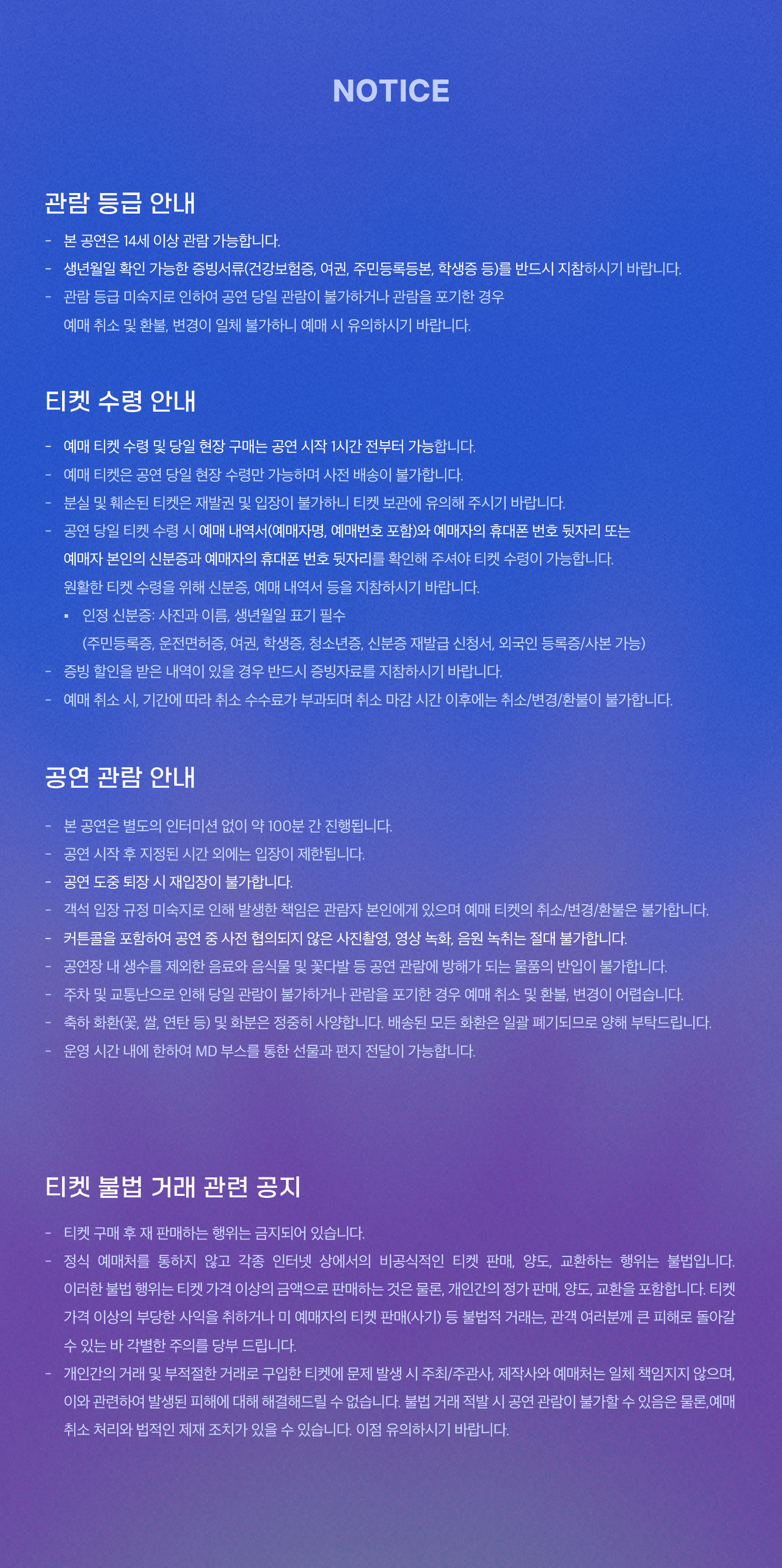 - 관람일 2일전 ~ 취소기한까지: 티켓금액의 30%