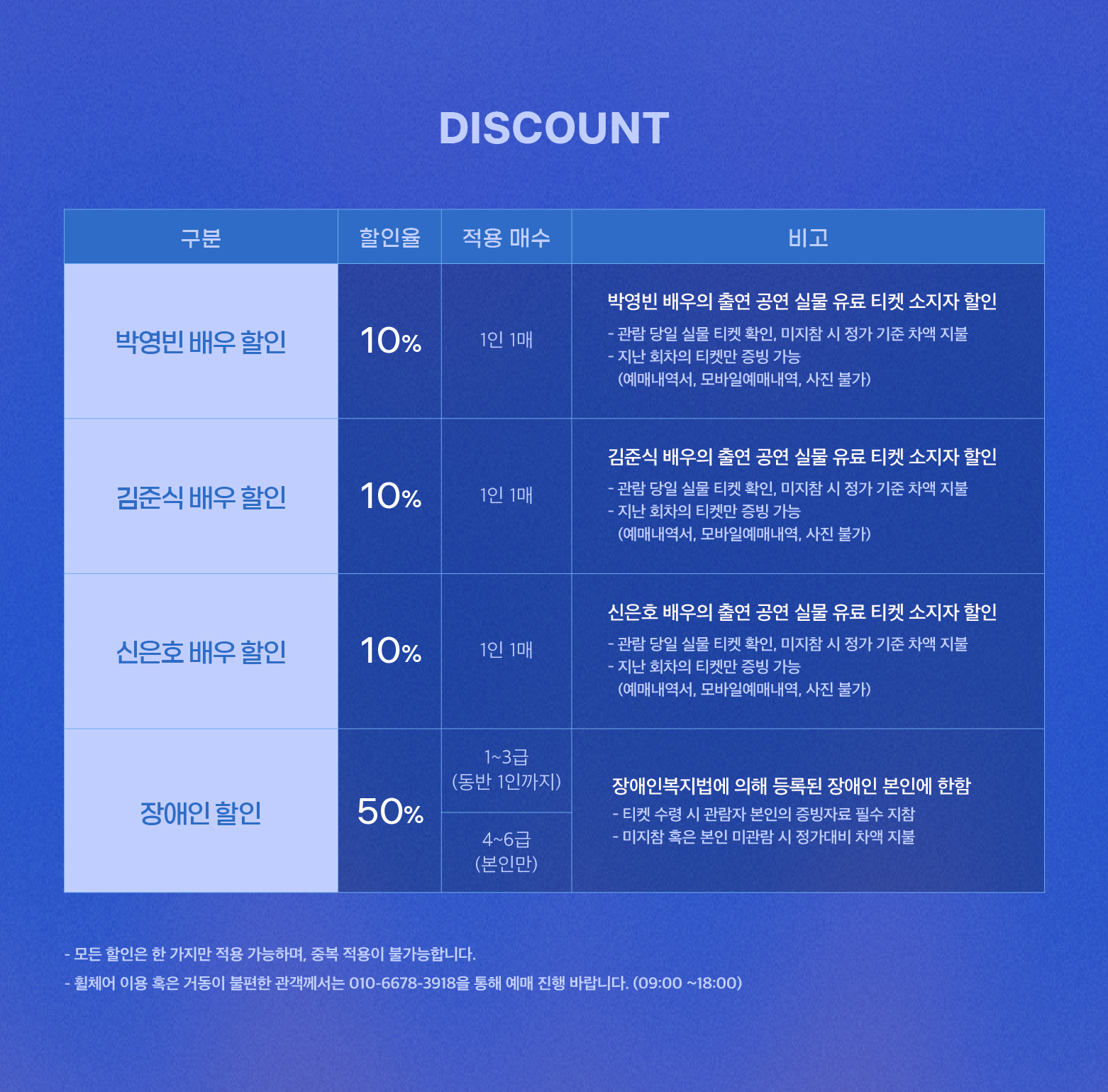 월~토요일 관람시: 전일 17시까지 / 일요일 관람시: 전일 11시까지