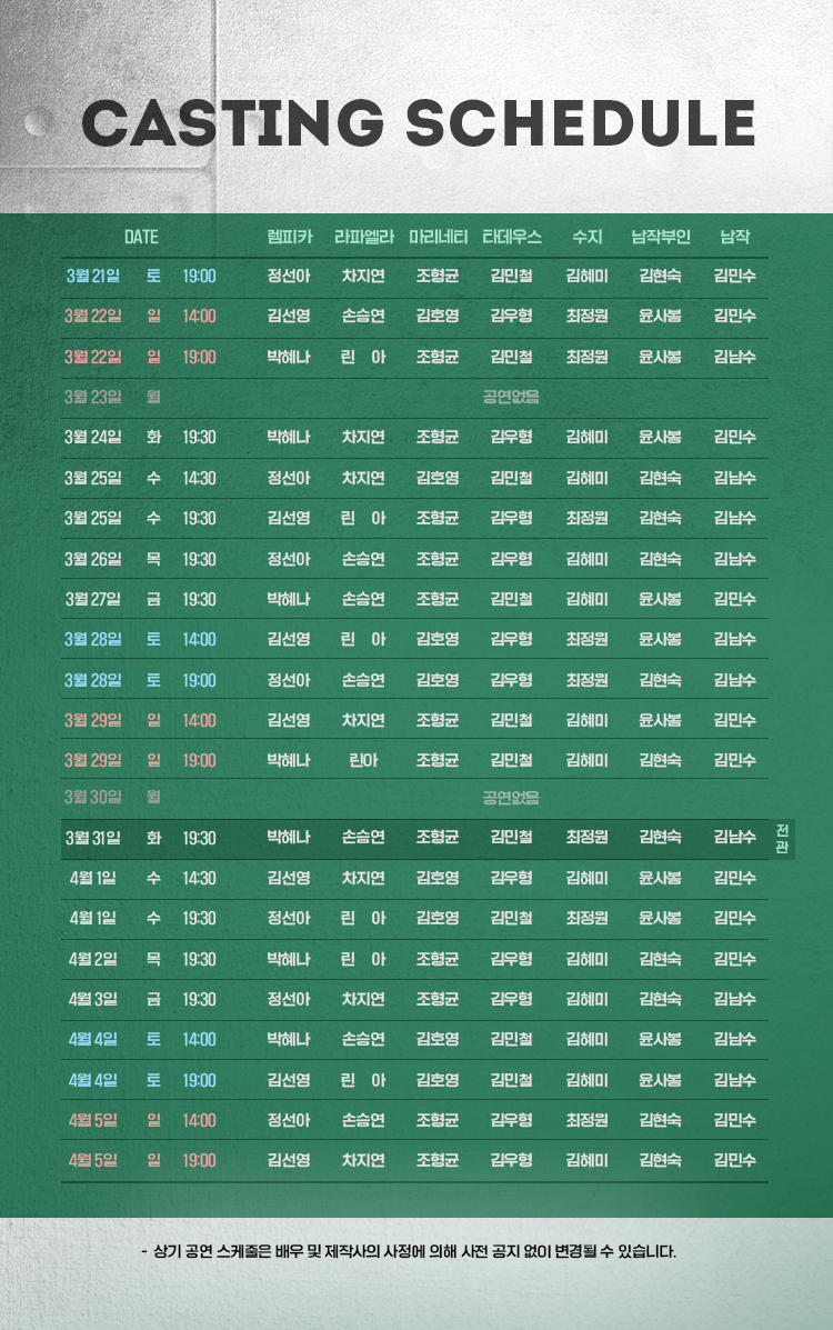 화, 목, 금 19:30 / 수 14:30, 19:30 / 토, 일, 공휴일 14:00, 19:00 / 월 공연 없음