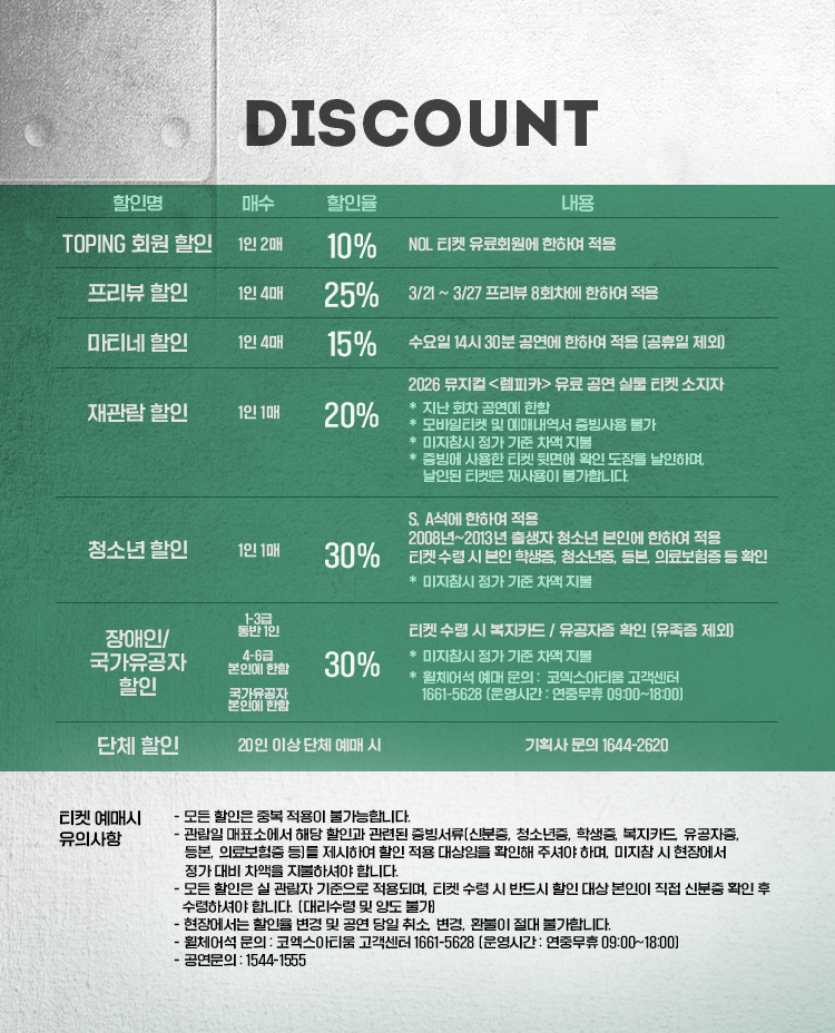 - 특정 기간, 특정 공연일에만 판매하는 가격이 있으니 예매 전 [가격 전체 보기]를 눌러 확인해 주세요.