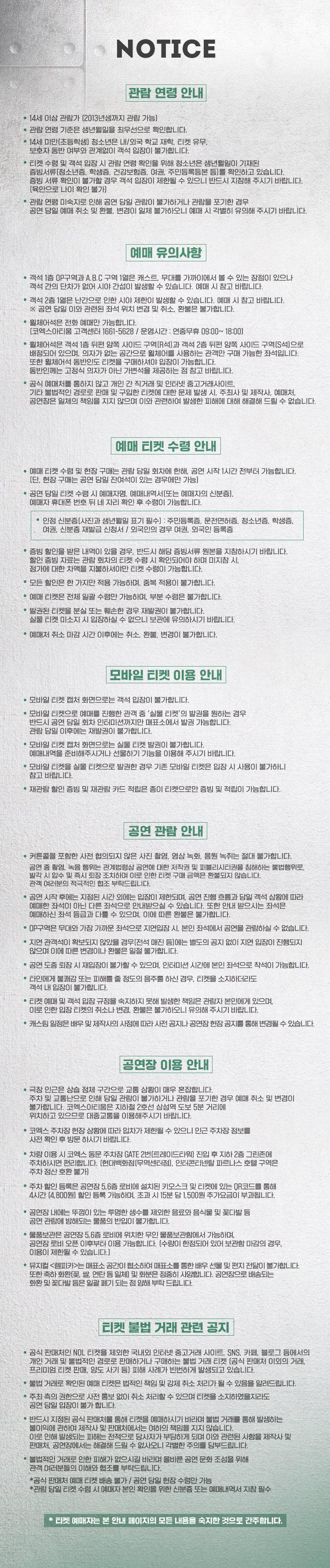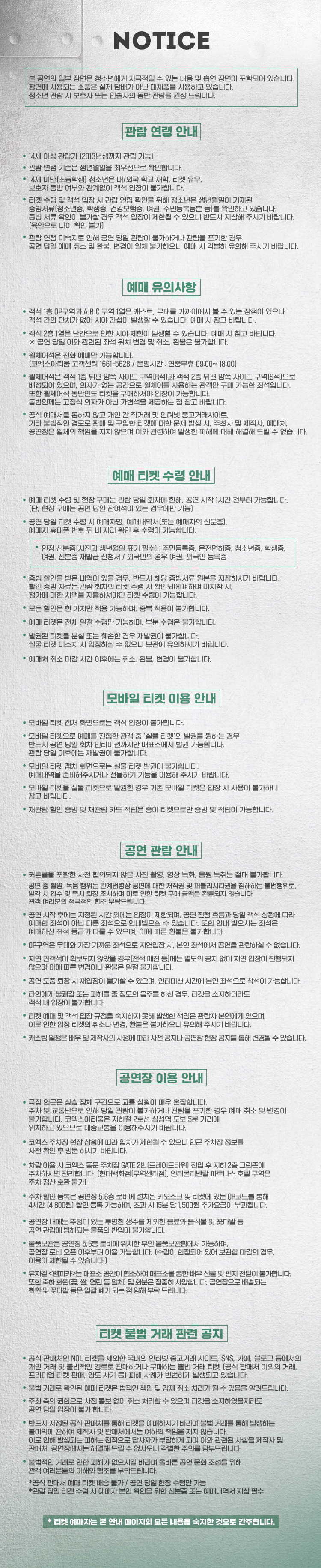 - 관람일 2일전 ~ 취소기한까지: 티켓금액의 30%