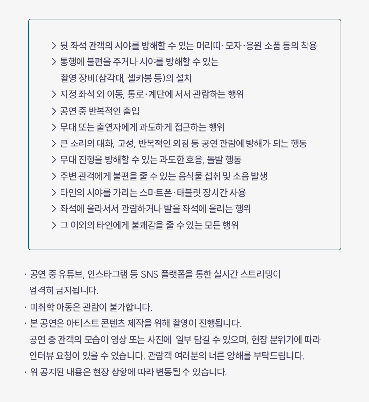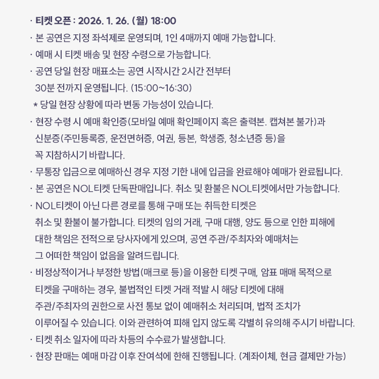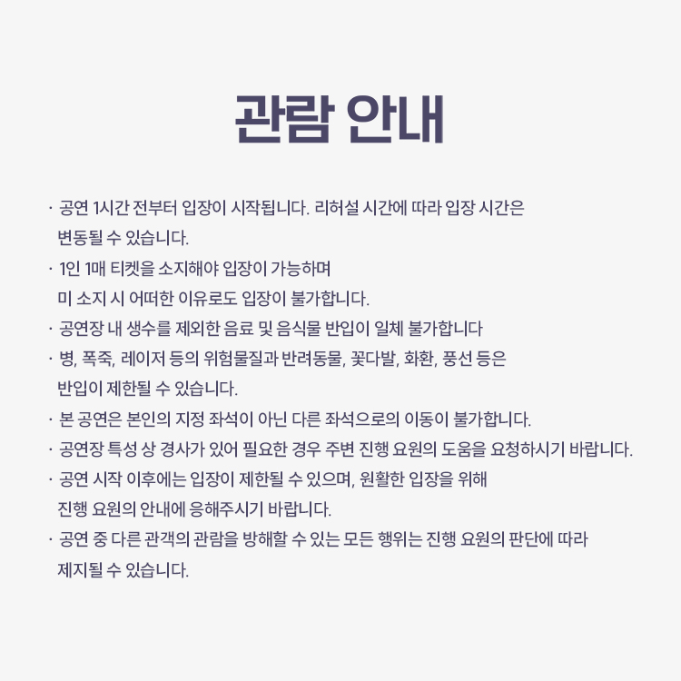 - 관람일 2일전 ~ 취소기한까지: 티켓금액의 30%