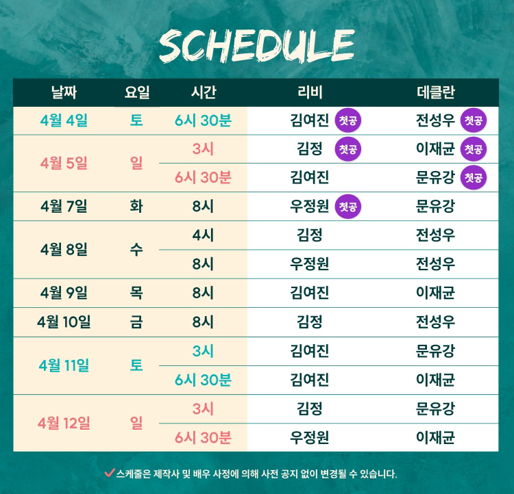 화, 목, 금 8시 / 수 4시, 8시 / 토. 일, 공휴일 3시, 6시 30분 (월 공연 없음)