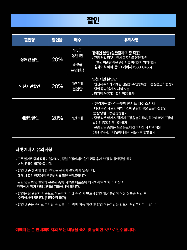 - 관람일 2일전 ~ 취소기한까지: 티켓금액의 30%