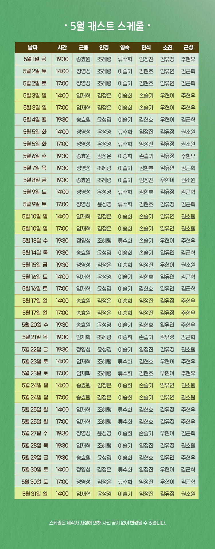 수~금 19:30 / 토~일 14:00, 17:00 / 월,화 휴관