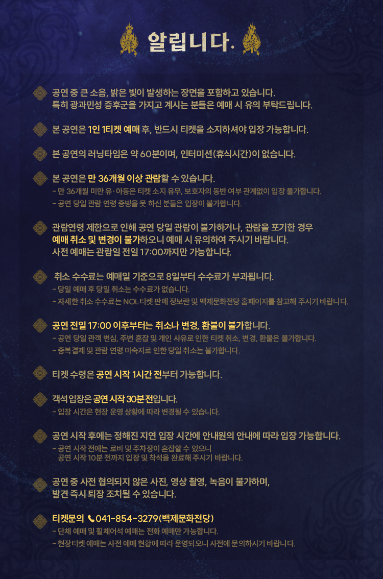 - 관람일 2일전 ~ 취소기한까지: 티켓금액의 30%