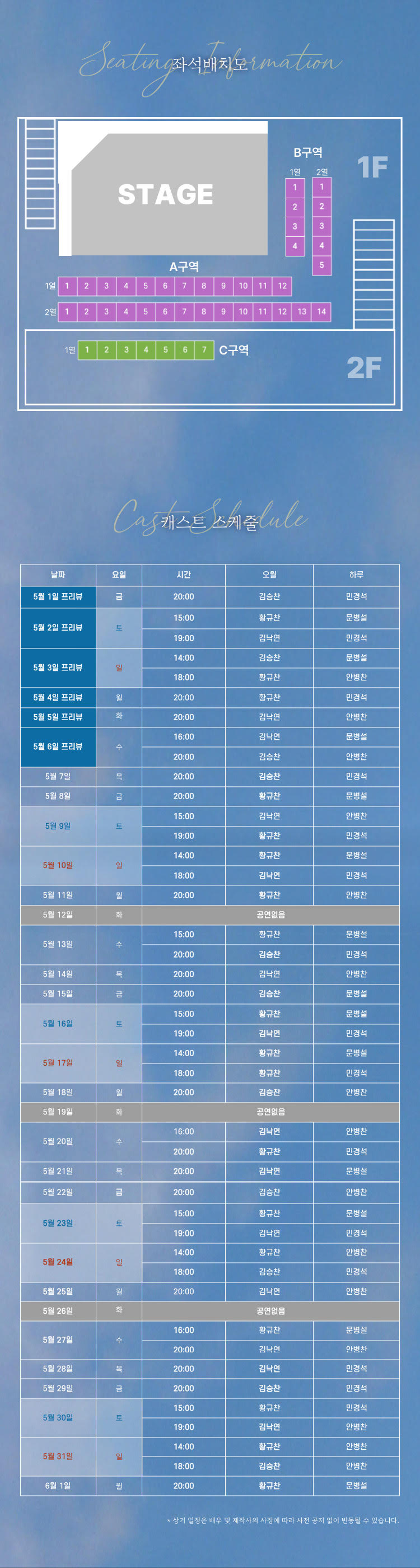월목금 20시 / 수 16시, 20시 / 토 15시, 19시 / 일 14시, 18시 / 화 공연없음 (5월 5일 20시)