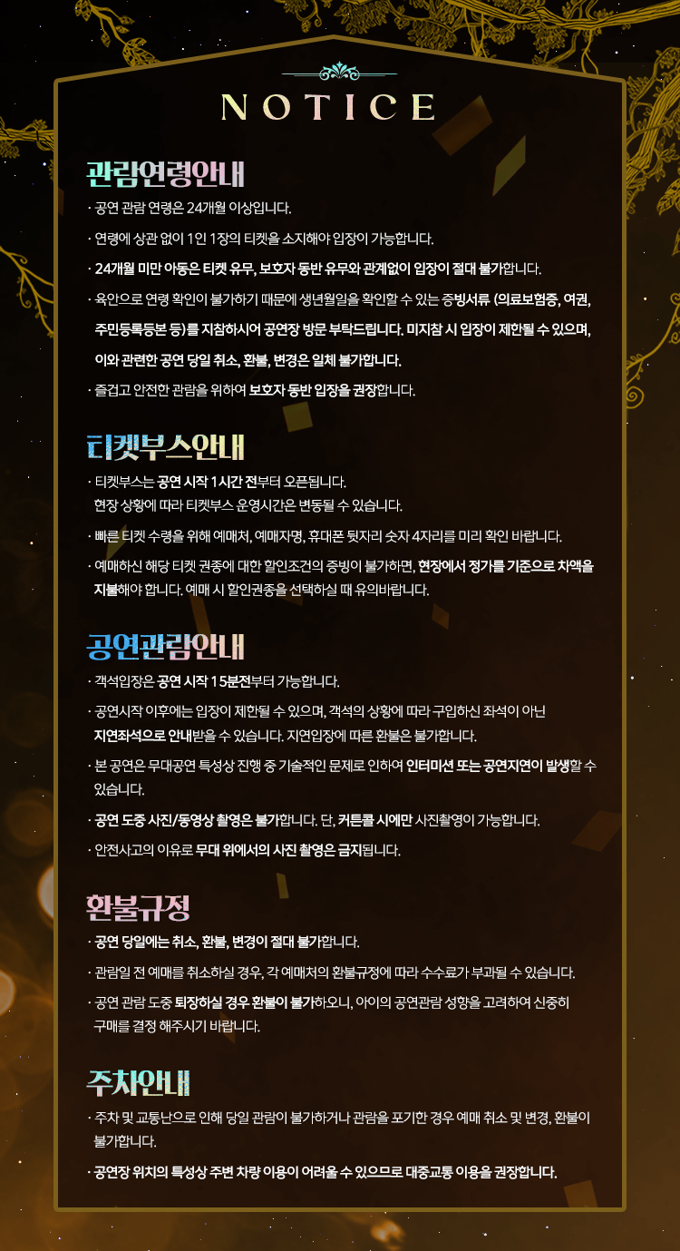 - 관람일 2일전 ~ 취소기한까지: 티켓금액의 30%