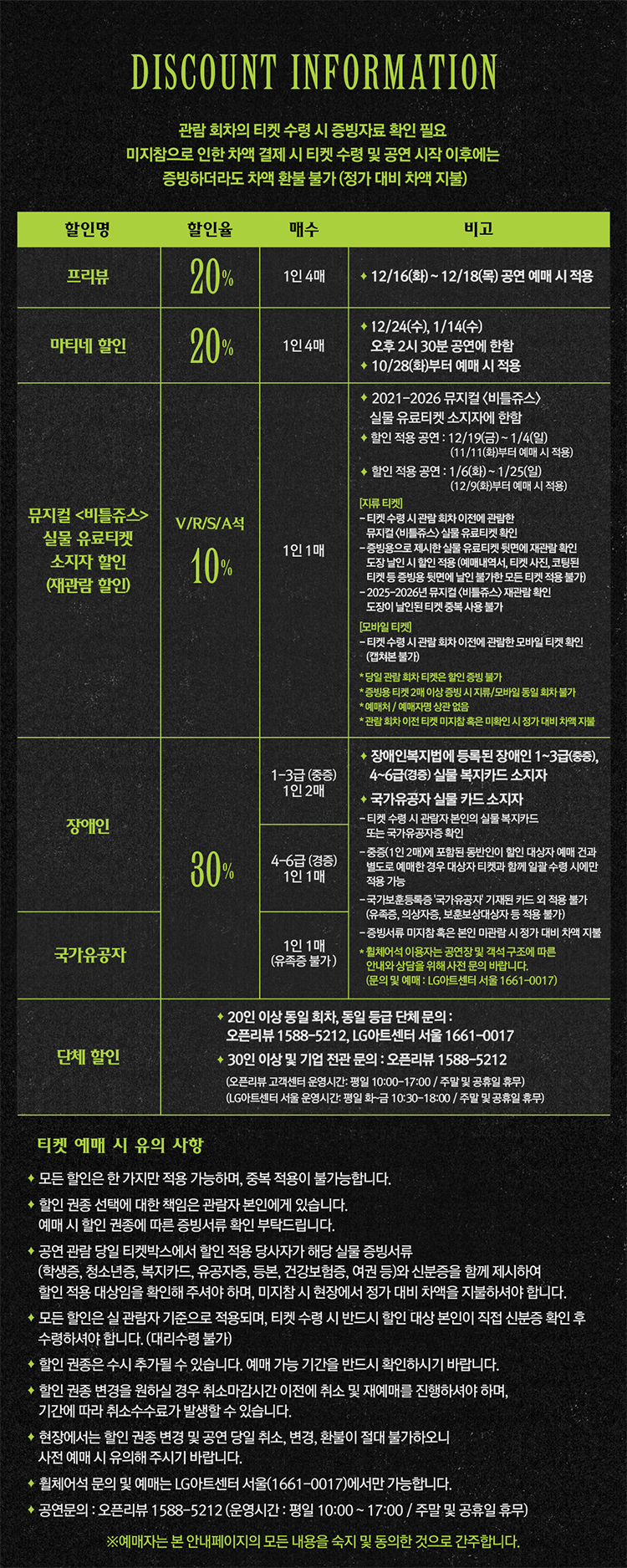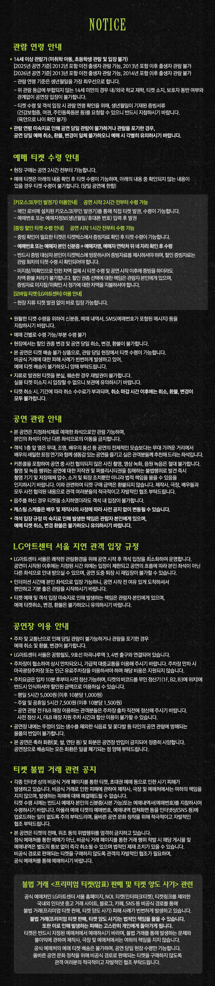 - 특정 기간, 특정 공연일에만 판매하는 가격이 있으니 예매 전 [가격 전체 보기]를 눌러 확인해 주세요.
