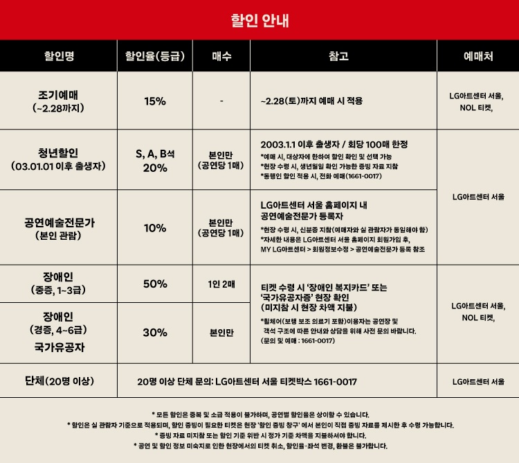 - 특정 기간, 특정 공연일에만 판매하는 가격이 있으니 예매 전 [가격 전체 보기]를 눌러 확인해 주세요.