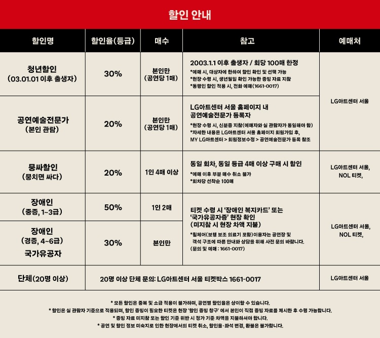 - 특정 기간, 특정 공연일에만 판매하는 가격이 있으니 예매 전 [가격 전체 보기]를 눌러 확인해 주세요.