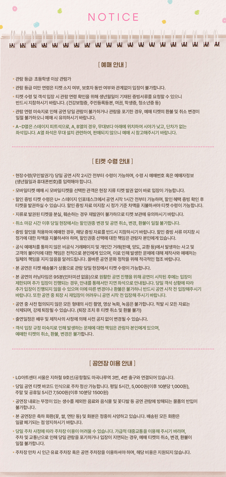 - 예매 후 7일 이내 취소시 티켓 금액 전액이 환불됩니다.(예매 수수료 제외)