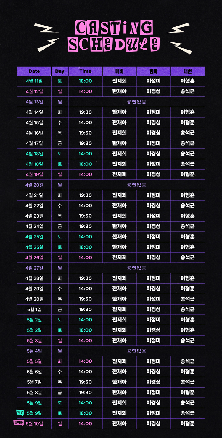 화, 목, 금 7:30pm / 토 2pm & 6pm / 수, 일, 공휴일 2pm / 월 공연없음