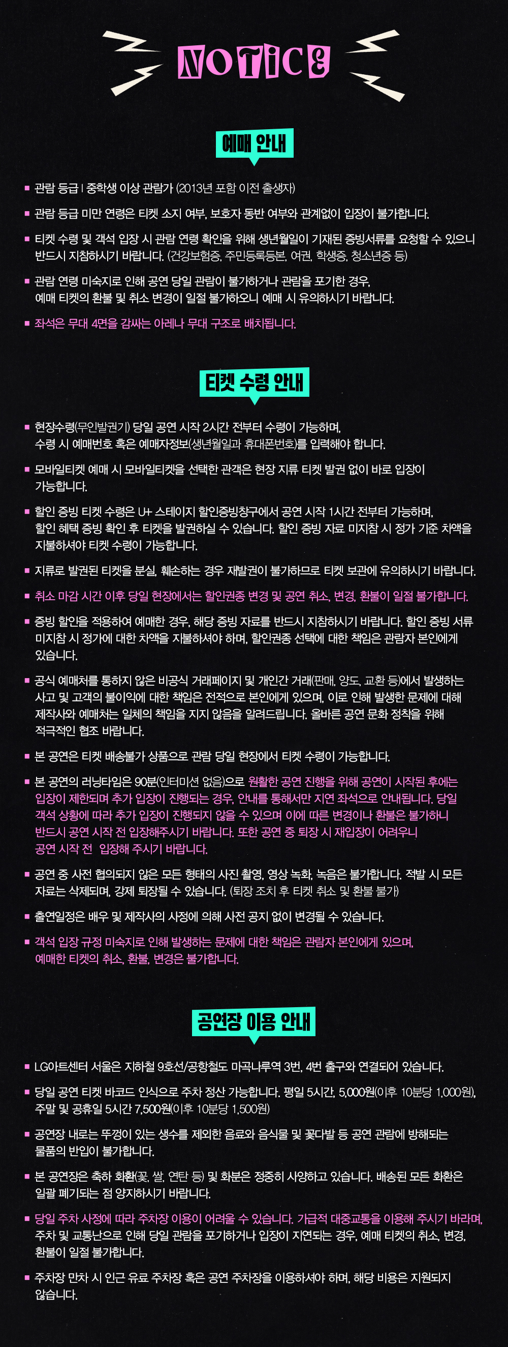 - 관람일 2일전 ~ 취소기한까지: 티켓금액의 30%
