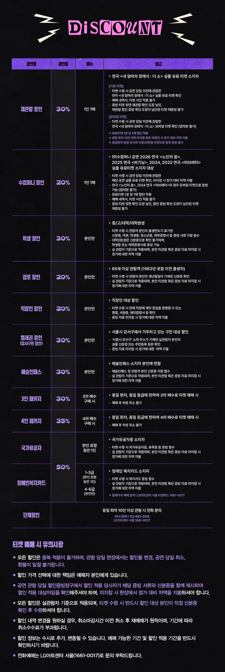 - 특정 기간, 특정 공연일에만 판매하는 가격이 있으니 예매 전 [가격 전체 보기]를 눌러 확인해 주세요.