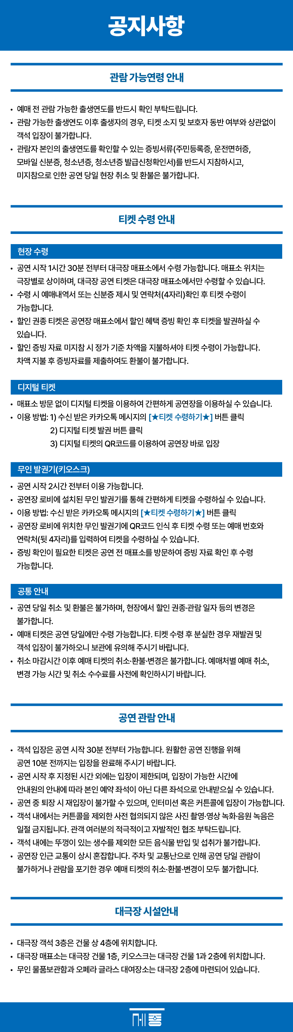 - 특정 기간, 특정 공연일에만 판매하는 가격이 있으니 예매 전 [가격 전체 보기]를 눌러 확인해 주세요.
