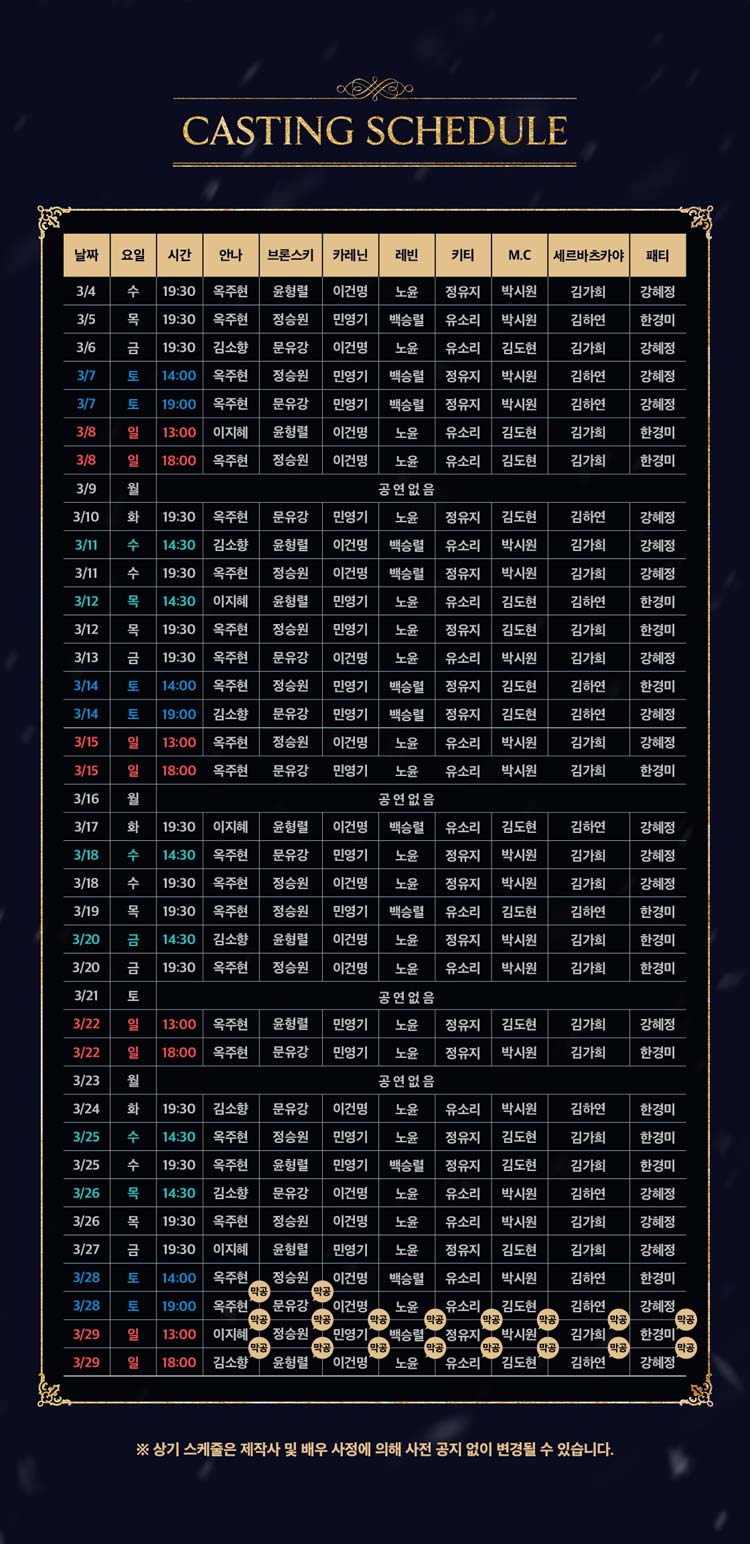 화,목,금 오후 7시 30분 / 수 오후 2시30분, 7시30분 / 토 오후 2시, 7시 / 일 및 공휴일 오후 1시, 6시 / 월 공연 없음