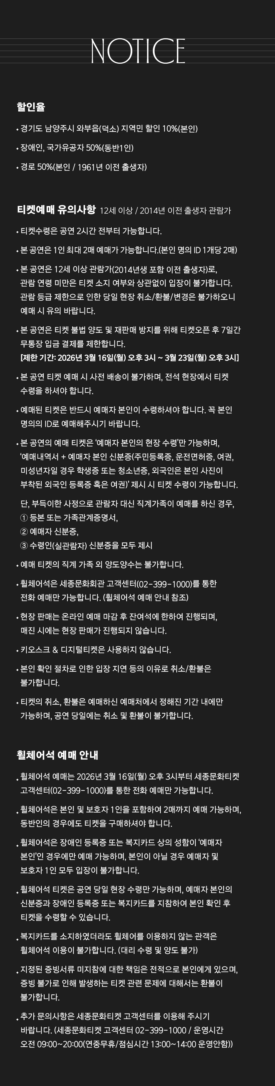 - 휠체어석 예매는 2026년 3월 16일(월) 오후 3시부터 세종문화티켓 고객센터(02-399-1000)를 통한 전화 예매만 가능합니다.