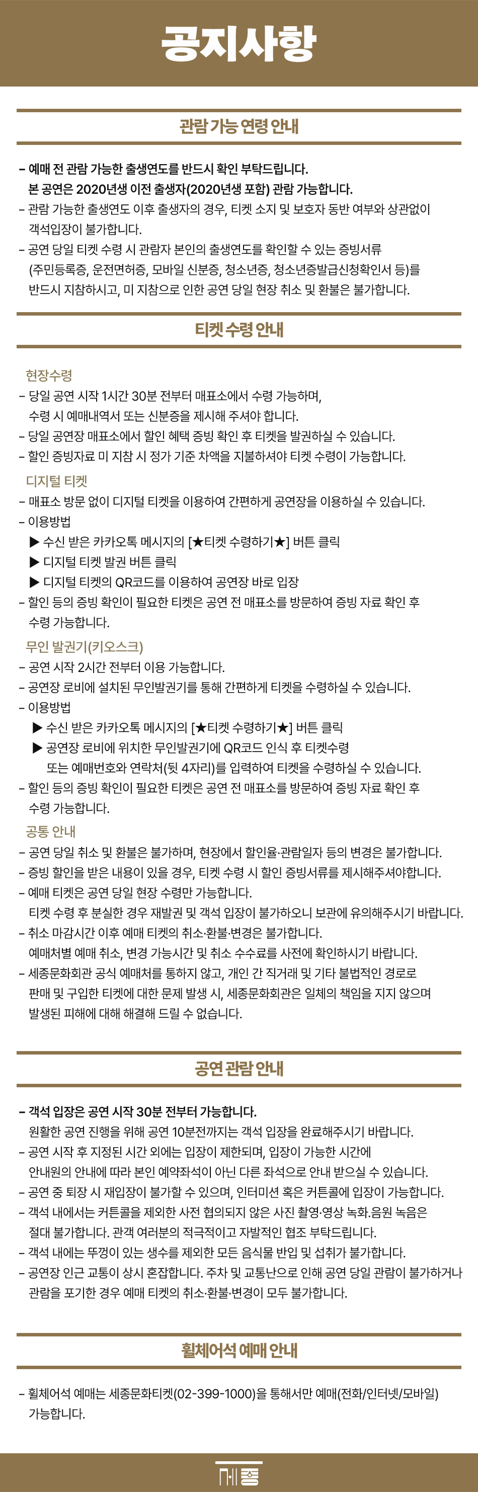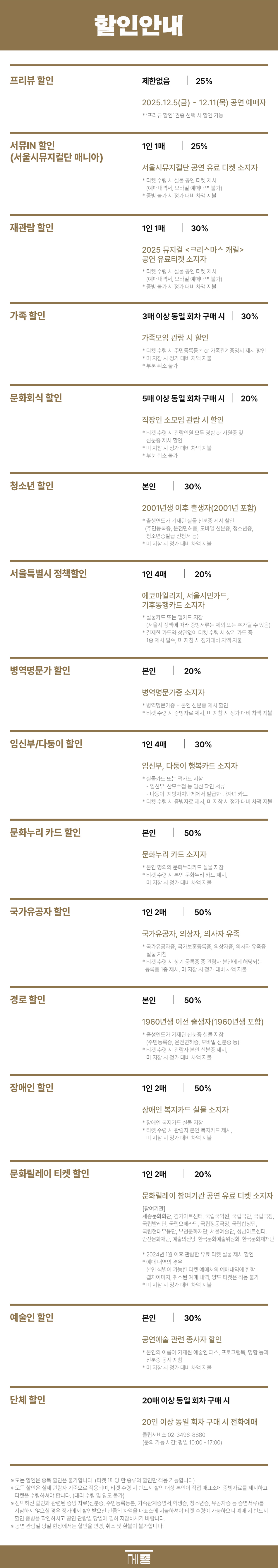 - 특정 기간, 특정 공연일에만 판매하는 가격이 있으니 예매 전 [가격 전체 보기]를 눌러 확인해 주세요.