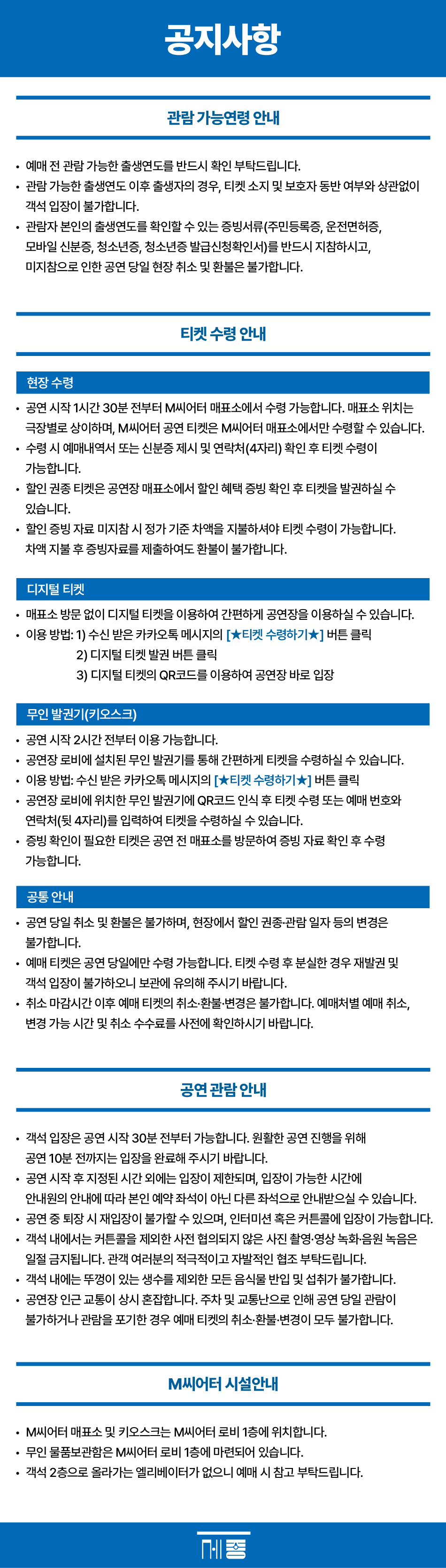 - 특정 기간, 특정 공연일에만 판매하는 가격이 있으니 예매 전 [가격 전체 보기]를 눌러 확인해 주세요.