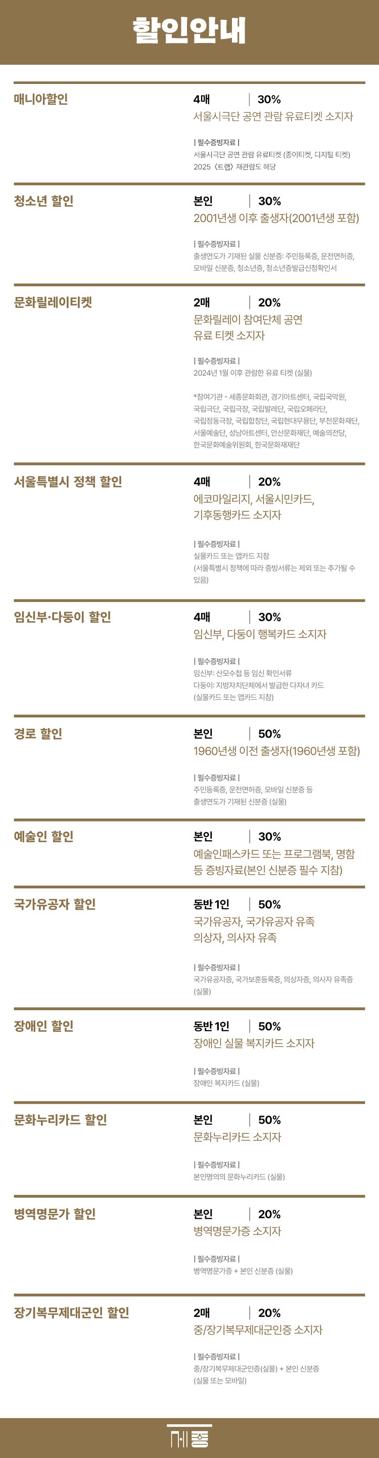 - 특정 기간, 특정 공연일에만 판매하는 가격이 있으니 예매 전 [가격 전체 보기]를 눌러 확인해 주세요.