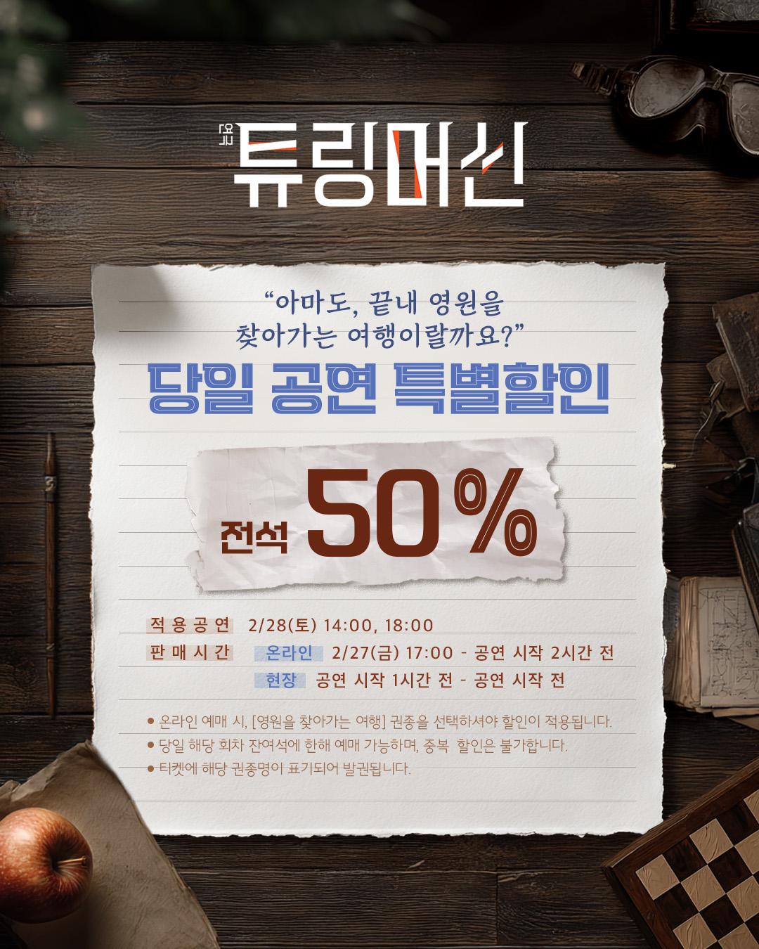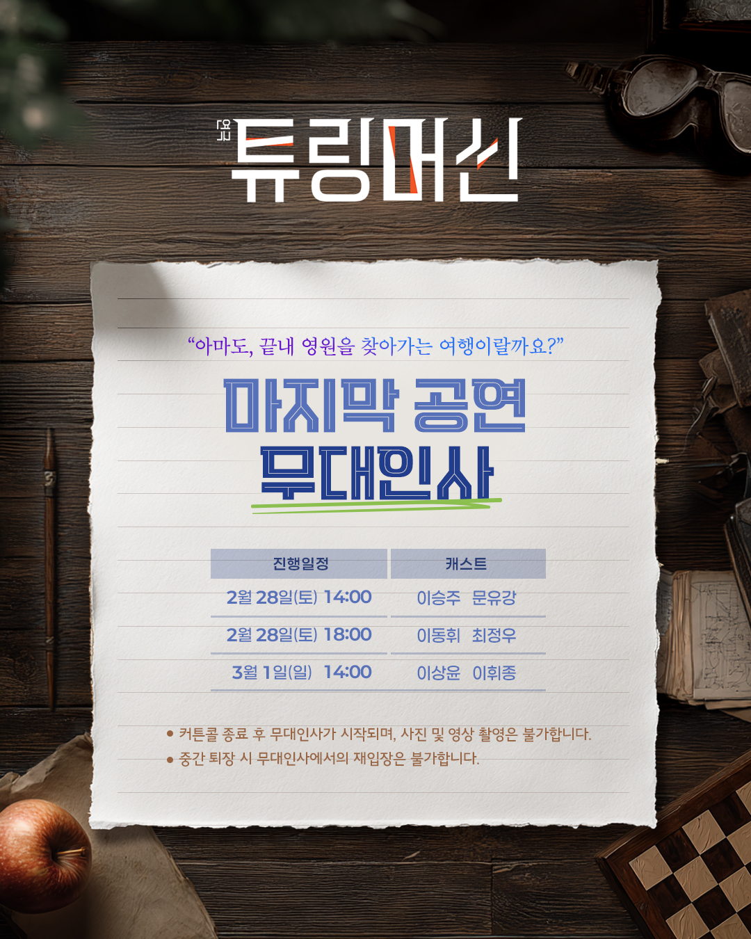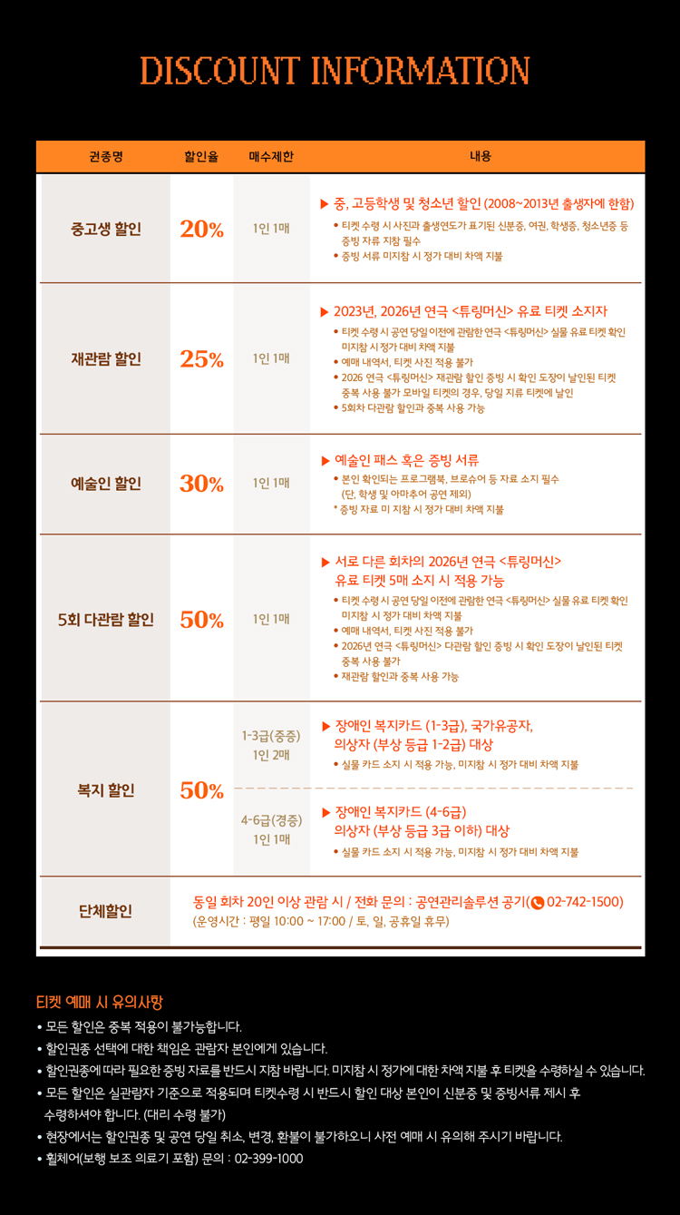* 1월 31일(토)공연부터 토/일 저녁공연시간이 18시로 변경되었습니다. 예매시 참고해 주시기 바랍니다.