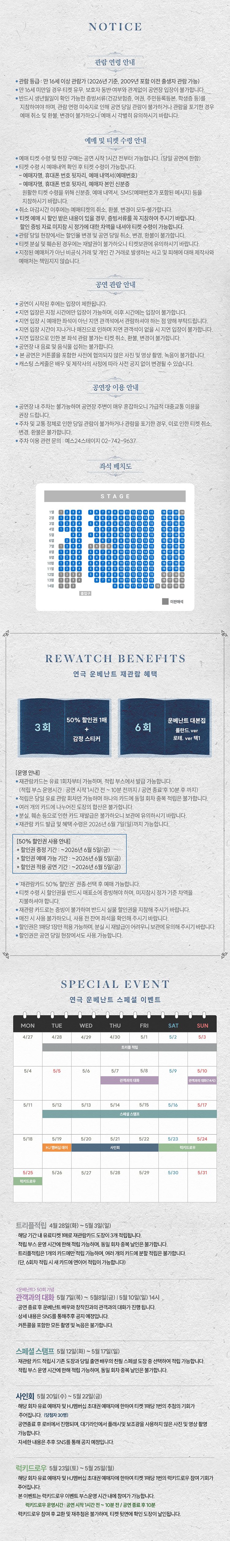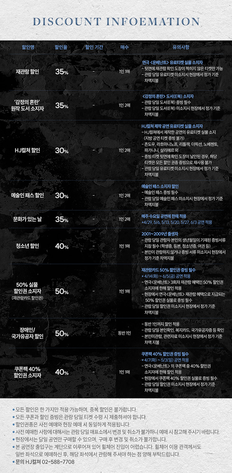- 관람일 2일전 ~ 취소기한까지: 티켓금액의 30%