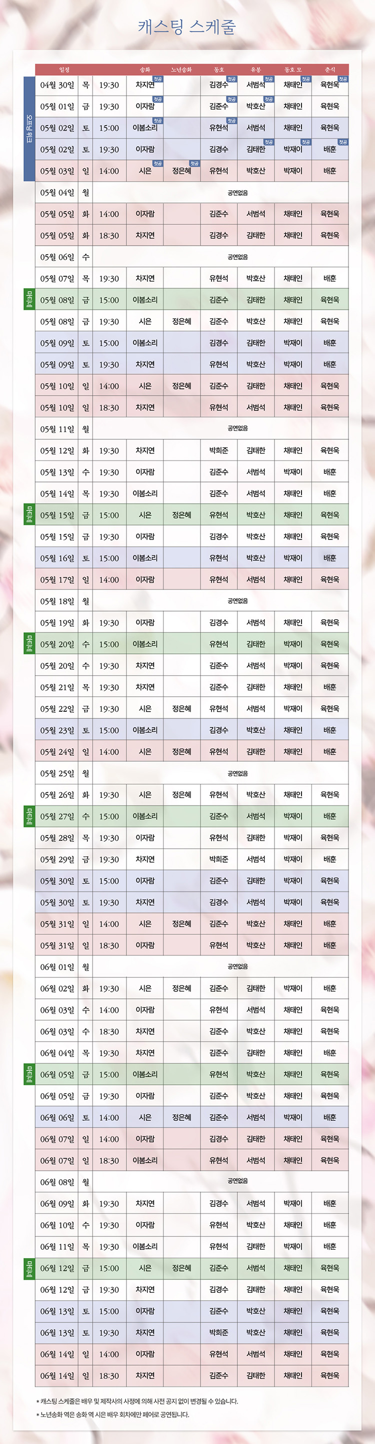 * 5/3(일), 5/17(일), 5/24(일), 6/6(토) 18시 30분 공연없음, 5/6(수) 공연없음