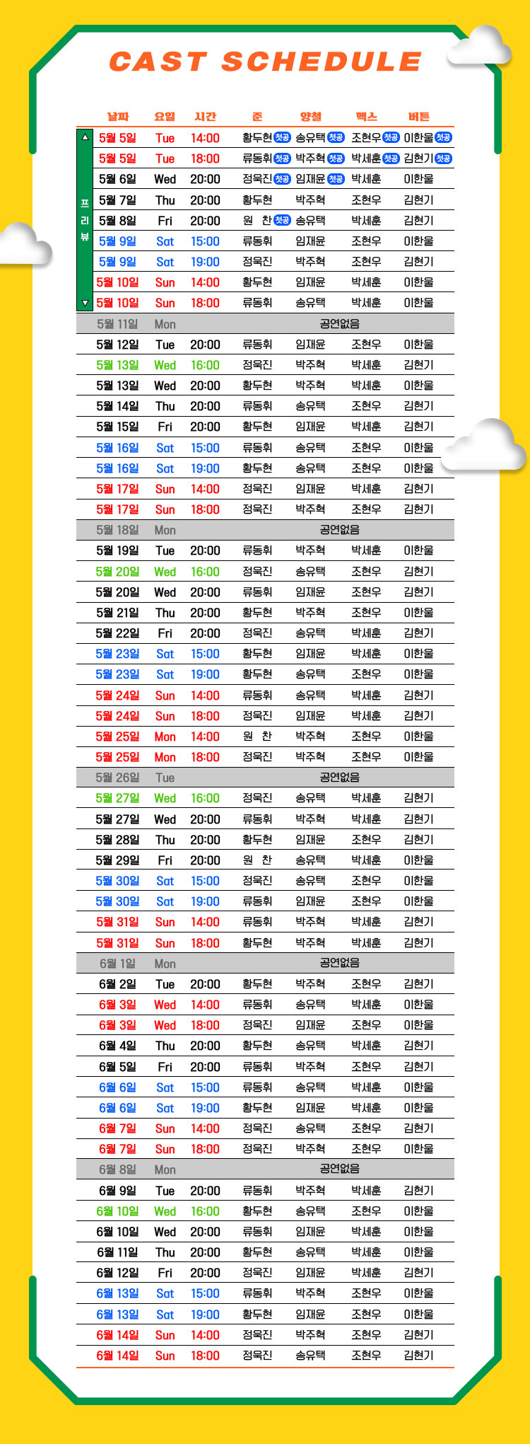 화,목,금 8시 / 수 4시, 8시 / 토 3시, 7시 / 일,공휴일 2시, 6시