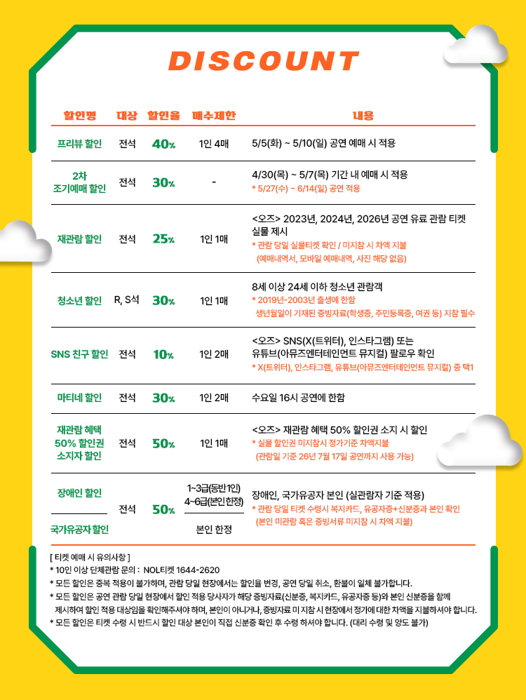 - 특정 기간, 특정 공연일에만 판매하는 가격이 있으니 예매 전 [가격 전체 보기]를 눌러 확인해 주세요.
