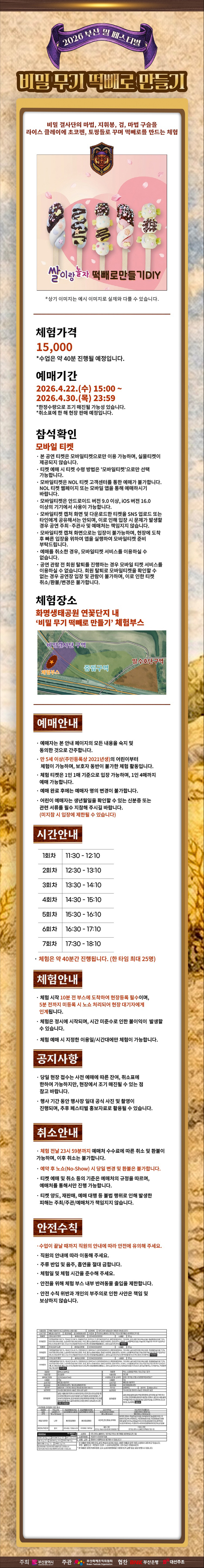 - 체험시간: 토,일 11:30 / 12:30 / 13:30 / 14:30 / 15:30 / 16:30 / 17:30