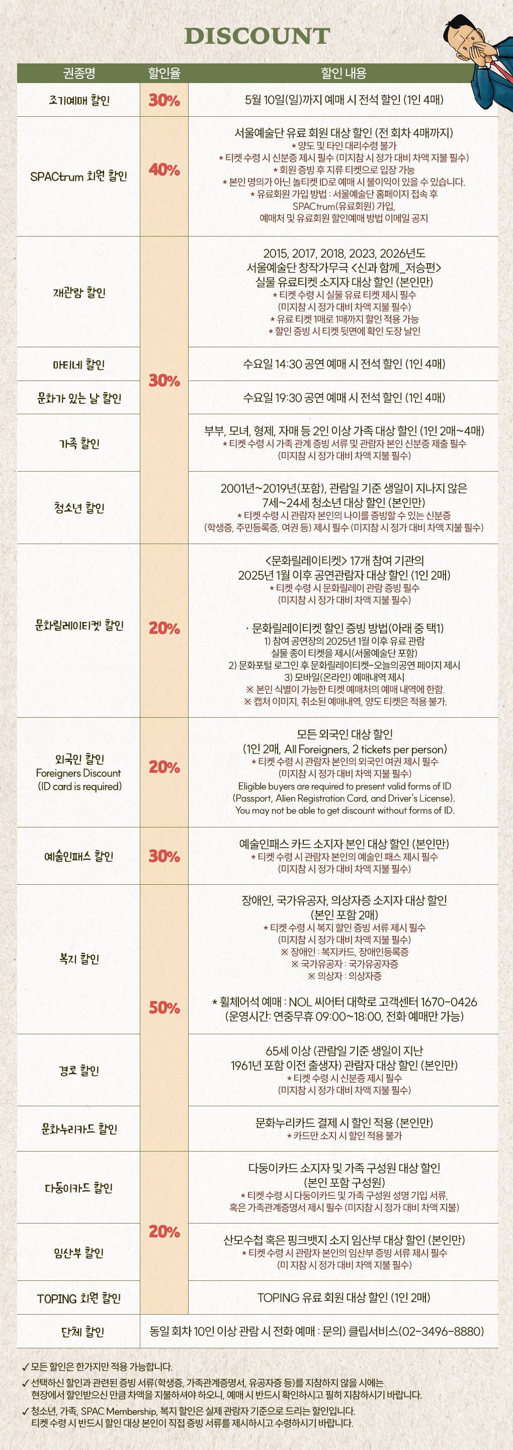 - 관람일 2일전 ~ 취소기한까지: 티켓금액의 30%