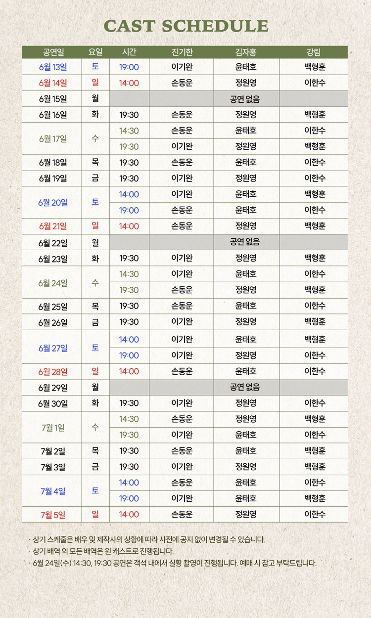 * 단, 6.13(토) 14:00 공연 없음 / 월 공연 없음