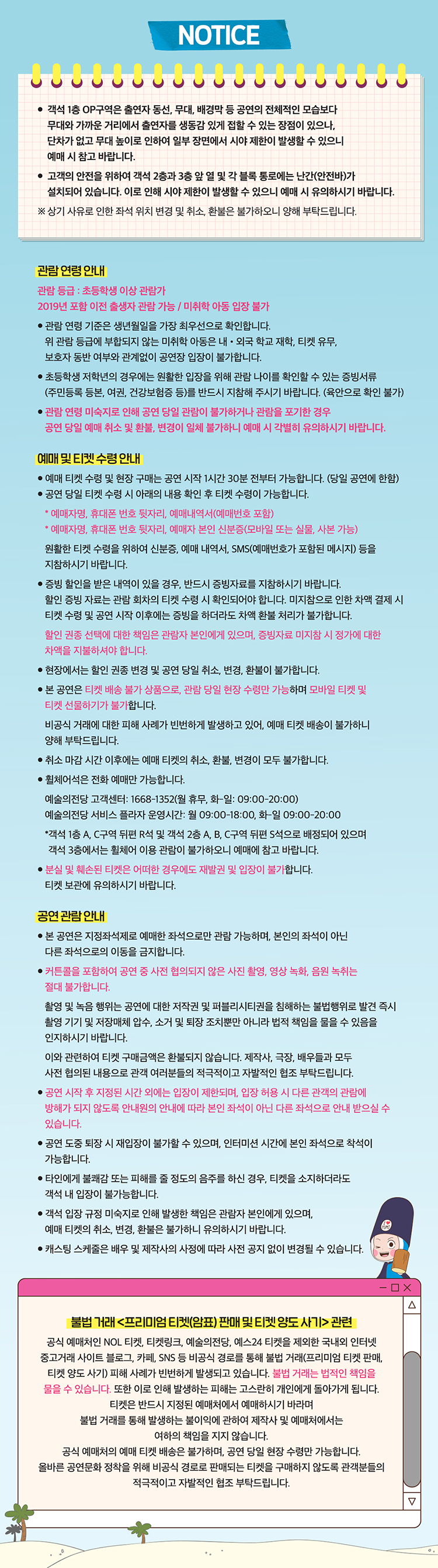 ※ 예매자는 본 안내 페이지의 모든 내용을 숙지하고 동의한 것으로 간주합니다.관람 연령 / 예매 및 티켓 수령 / 공연 관람 안내 미숙지로 인해 당일 관람이 불가하거나 포기하는 경우에도 예매 취소, 환불 및 일자 변경이 불가 하오니 예매 시 각별히 유의하시기 바랍니다.