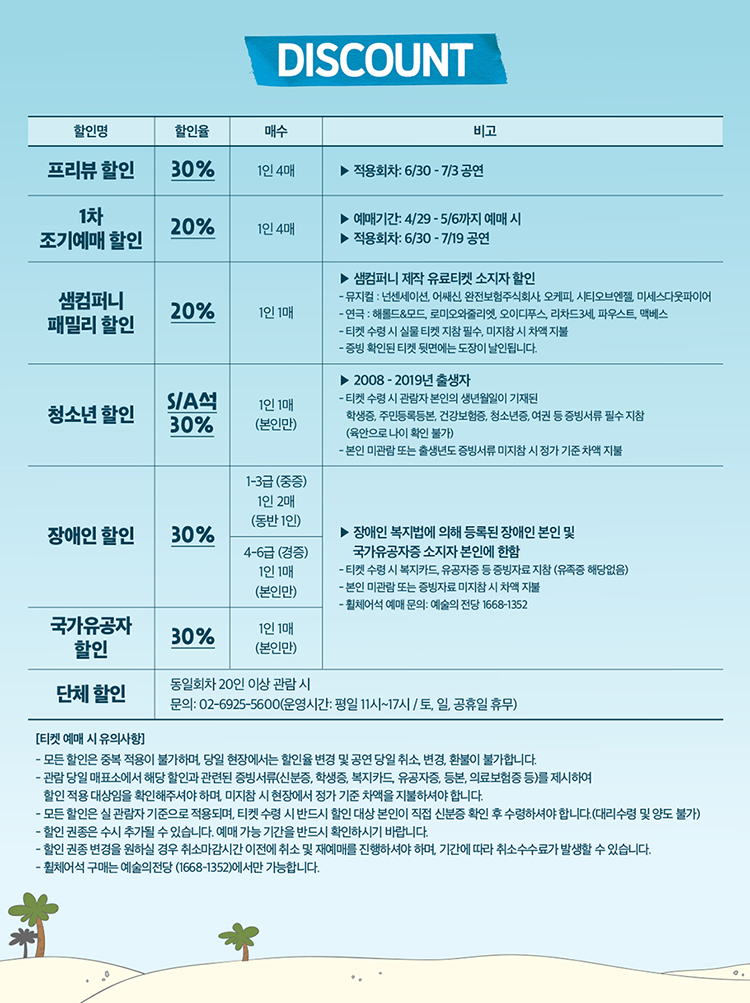 - 현장에서는 할인권종 변경 및 공연 당일 취소, 환불, 변경이 불가합니다.