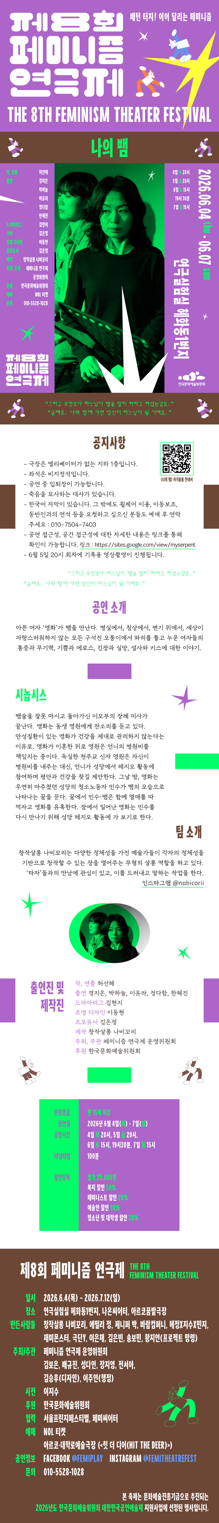 아래 쪽 테두리의 글자. 일시 : 2026년 6월 4일 목요일부터 7월 12일 일요일까지. 장소 : 연극실험실 혜화동1번지, 나온씨어터, 아르코꿈밭극장. 주최/주관 : 페미니즘 연극제 운영위원회. 후원 : 한국문화예술위원회. 협력 : 서울 프린지 페스티벌, 페미씨어터. 예매 : NOL티켓, 아르코·대학로 예술극장(). 공연 정보 : Facebook 아이디 @femiplay, 인스타그램 아이디 @femitheatrefest, 문의 : 010-5528-1028